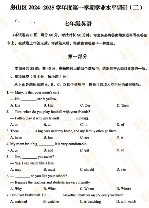 2025-2026学年(上)房山区初一期末英语试卷及答案预计在2026年1月出炉!家长可先下载去年期末试题,练习提升!新试卷公布后将更新在本页面,建议(Ctrl+D)收藏本页面!