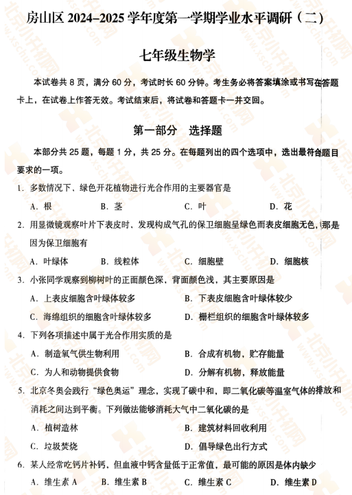 2025-2026学年(上)房山区初一期末生物试卷及答案预计在2026年1月出炉!家长可先下载去年期末试题,练习提升!新试卷公布后将更新在本页面,建议(Ctrl+D)收藏本页面!