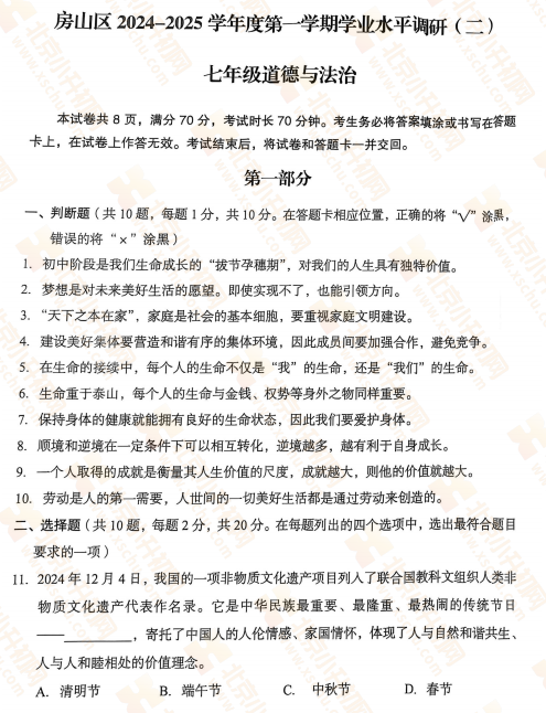 2025-2026学年(上)房山区初一期末道德与法治试卷及答案预计在2026年1月出炉!家长可先下载去年期末试题,练习提升!新试卷公布后将更新在本页面,建议(Ctrl+D)收藏本页面!