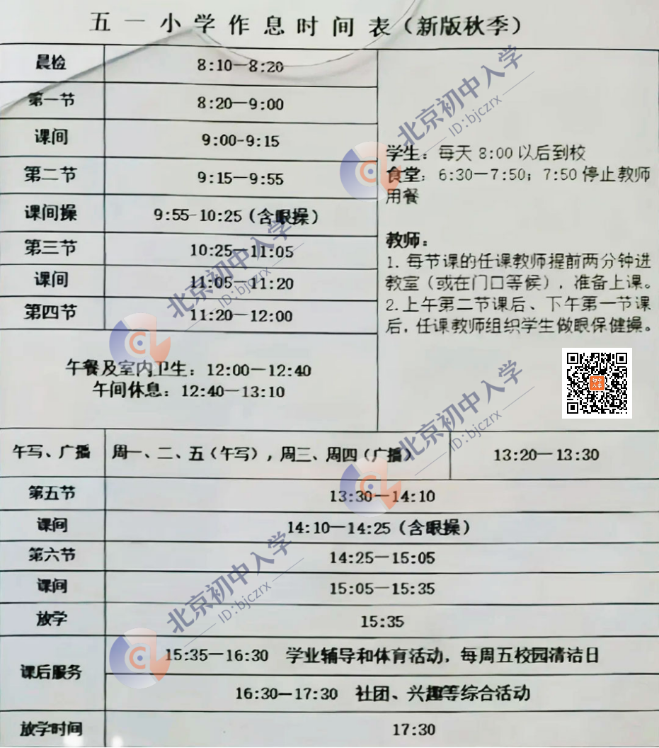 北京小升初网收集整理:2025-2026学年第一学期北京海淀区五一小学作息时间、课表,供小学家长参考!