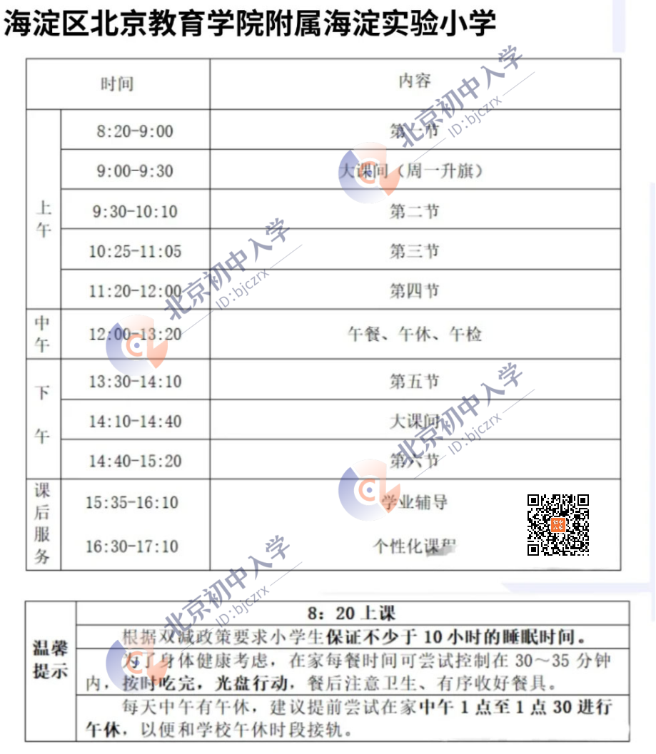 北京小升初网收集整理:2025-2026学年第一学期海淀区北京教育学院附属海淀实验小学作息时间、课表,供小学家长参考!