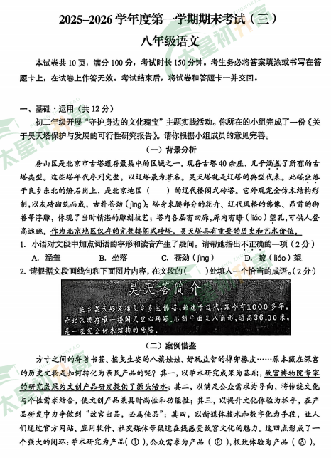 房山区2025-2026学年第一学期初二期末语文试卷及答案什么时候出?考哪些内容?如何下载?