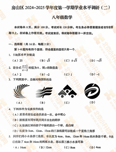 2025-2026学年(上)房山区初二期末数学试卷及答案预计在2026年1月出炉!家长可先下载去年期末试题,练习提升!新试卷公布后将更新在本页面,建议(Ctrl+D)收藏本页面!
