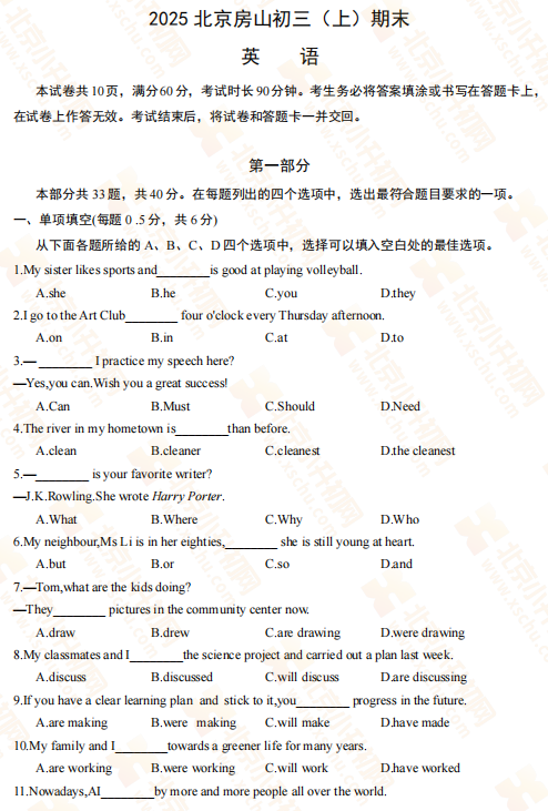 2025-2026学年(上)房山区初三期末英语试卷及答案预计在2026年1月出炉!家长可先下载去年期末试题,练习提升!新试卷公布后将更新在本页面,建议(Ctrl+D)收藏本页面!