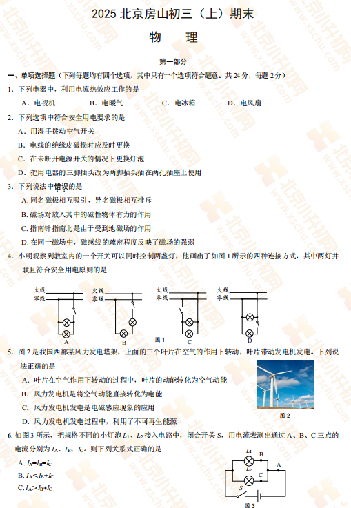 2025-2026学年(上)房山区初三期末物理试卷及答案预计在2026年1月出炉!家长可先下载去年期末试题,练习提升!新试卷公布后将更新在本页面,建议(Ctrl+D)收藏本页面!