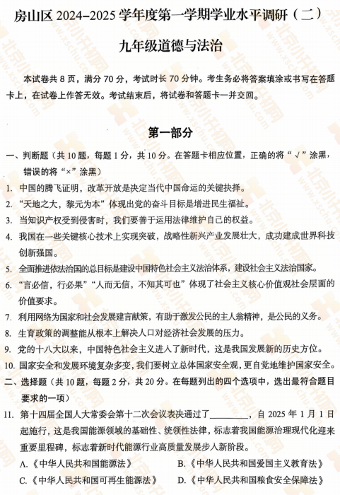 2025-2026学年(上)房山区初三期末道德与法治试卷及答案预计在2026年1月出炉!家长可先下载去年期末试题,练习提升!新试卷公布后将更新在本页面,建议(Ctrl+D)收藏本页面!