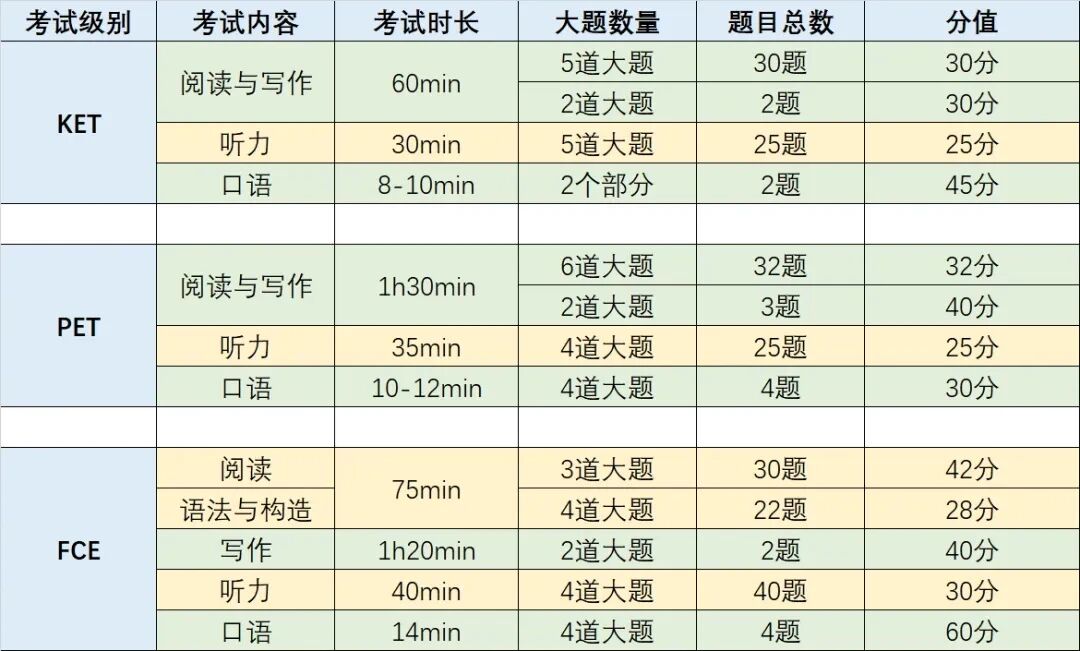 KET考试结构包括阅读与写作、听力、口语三部分内容,其中阅读与写作部分占总分的50%,听力、口试各占25%。剑桥五级前3个级别各部分的分值占比如下: