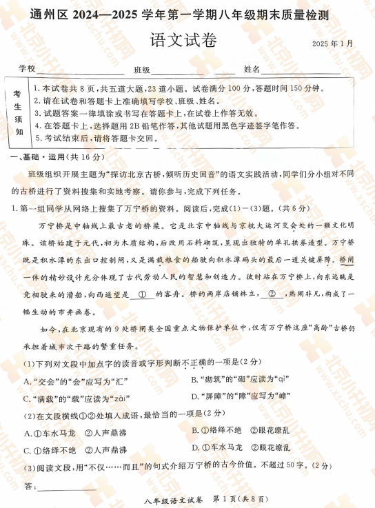 2025-2026学年(上)通州初二期末语文试卷及答案预计在2026年1月出炉!家长可先下载去年期末试题,练习提升!新试卷公布后将更新在本页面,建议(Ctrl+D)收藏本页面!