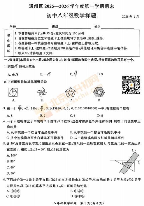 2025-2026学年第一学期通州初二期末数学试卷及答案什么时候出?考哪些内容?如何下载?
