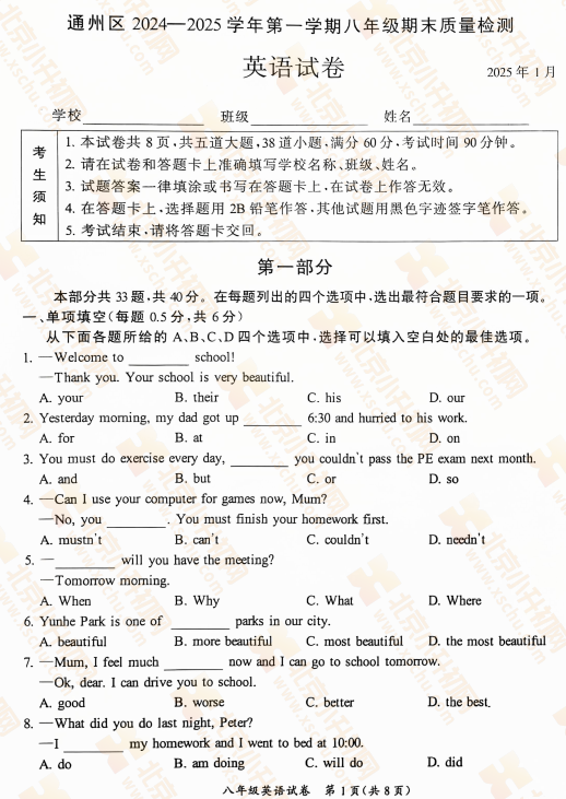 2025-2026学年(上)通州初二期末英语试卷及答案预计在2026年1月出炉!家长可先下载去年期末试题,练习提升!新试卷公布后将更新在本页面,建议(Ctrl+D)收藏本页面!