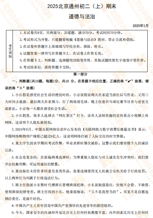 2025-2026学年第一学期通州初二期末道德与法治试卷及答案什么时候出?考哪些内容?如何下载?