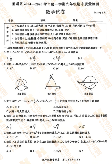 2025-2026学年(上)通州初三期末数学试卷及答案预计在2026年1月出炉!家长可先下载去年期末试题,练习提升!新试卷公布后将更新在本页面,建议(Ctrl+D)收藏本页面!