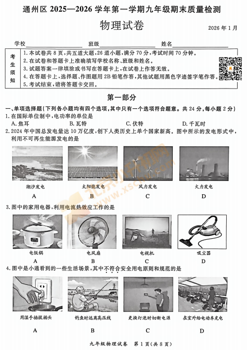 2025-2026学年第一学期通州初三期末物理试卷及答案什么时候出?考哪些内容?如何下载?