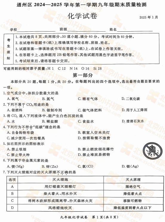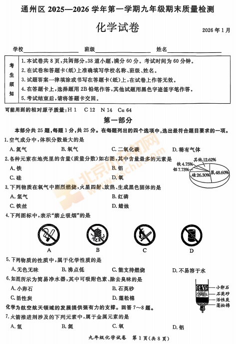 2025-2026学年第一学期通州初三期末化学试卷及答案什么时候出?考哪些内容?如何下载?