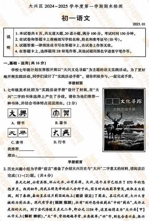 2025-2026学年(上)大兴初一期末语文试卷及答案预计在2026年1月出炉!家长可先下载去年期末试题,练习提升!新试卷公布后将更新在本页面,建议(Ctrl+D)收藏本页面!