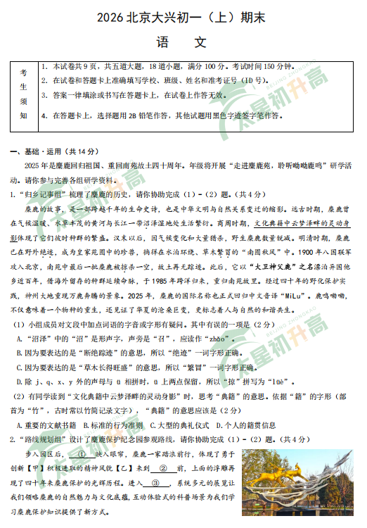 2025-2026学年第一学期大兴初一期末语文试卷及答案什么时候出?考哪些内容?如何下载?