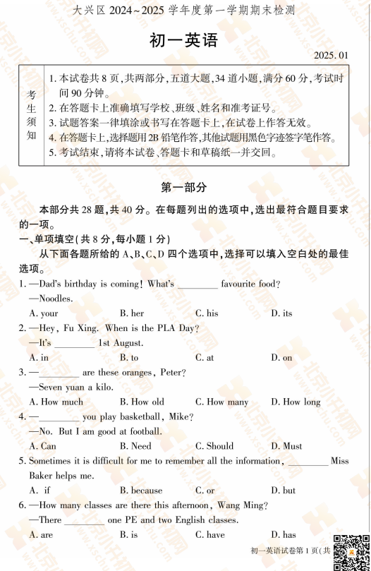 2025-2026学年(上)大兴初一期末英语试卷及答案预计在2026年1月出炉!家长可先下载去年期末试题,练习提升!新试卷公布后将更新在本页面,建议(Ctrl+D)收藏本页面!
