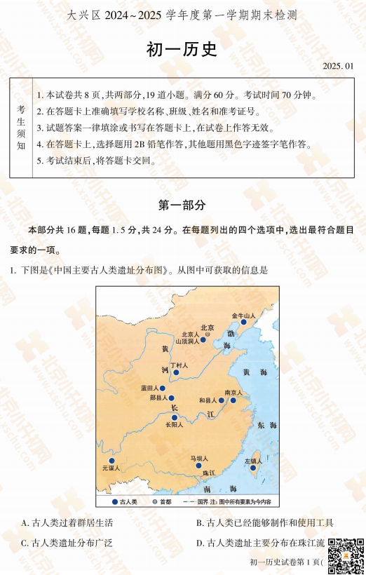 2025-2026学年(上)大兴初一期末历史试卷及答案预计在2026年1月出炉!家长可先下载去年期末试题,练习提升!新试卷公布后将更新在本页面,建议(Ctrl+D)收藏本页面!