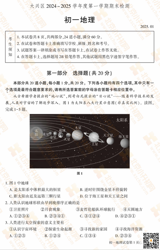 2025-2026学年(上)大兴初一期末地理试卷及答案预计在2026年1月出炉!家长可先下载去年期末试题,练习提升!新试卷公布后将更新在本页面,建议(Ctrl+D)收藏本页面!