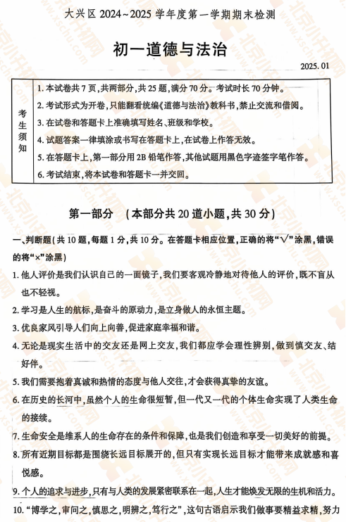 2025-2026学年(上)大兴初一期末道德与法治试卷及答案预计在2026年1月出炉!家长可先下载去年期末试题,练习提升!新试卷公布后将更新在本页面,建议(Ctrl+D)收藏本页面!