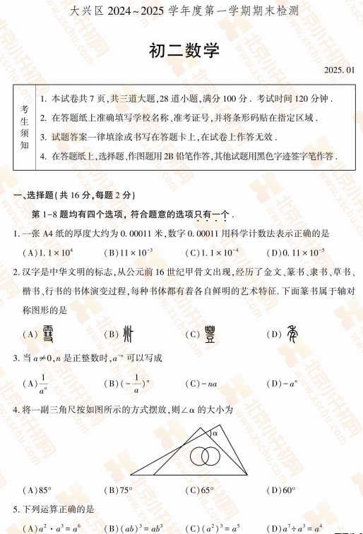 2025-2026学年(上)大兴初二期末数学试卷及答案预计在2026年1月出炉!家长可先下载去年期末试题,练习提升!新试卷公布后将更新在本页面,建议(Ctrl+D)收藏本页面!