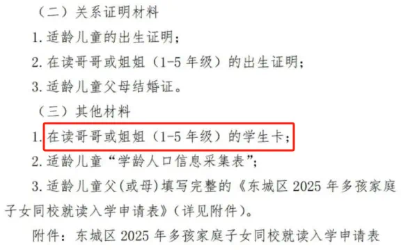 注意!根据东城区政策要求来看,多子女家庭想申请同校就读,需提供在读哥哥或姐姐(1-5年级)的学生卡👇