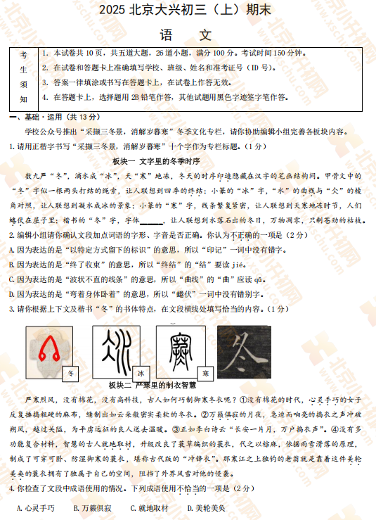 2025-2026学年第一学期大兴初三期末语文试卷及答案什么时候出?考哪些内容?如何下载?