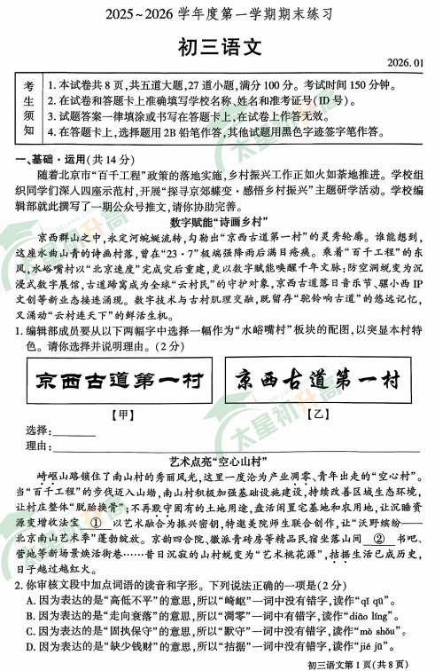 2025-2026学年(上)大兴初三期末语文试卷及答案已出炉!下载完整版试卷请点击文末pdf文件!或点击下方图片打包下载2026年北京各区初中期末试卷!