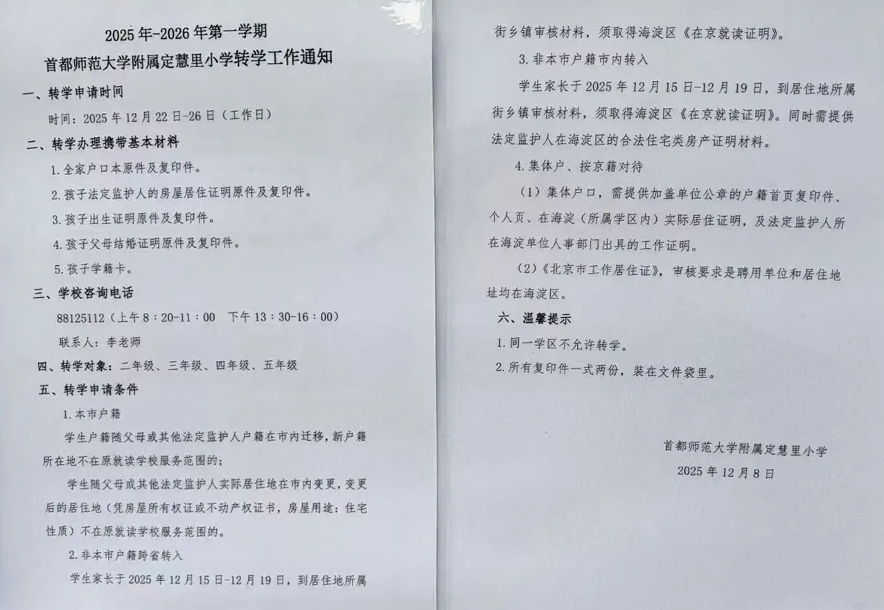 2025-2026学年第一学期首师大附属定慧里小学转学通知已发布,转学申请时间、转学申请条件、办理流程、联系方式等,具体安排说明如下: