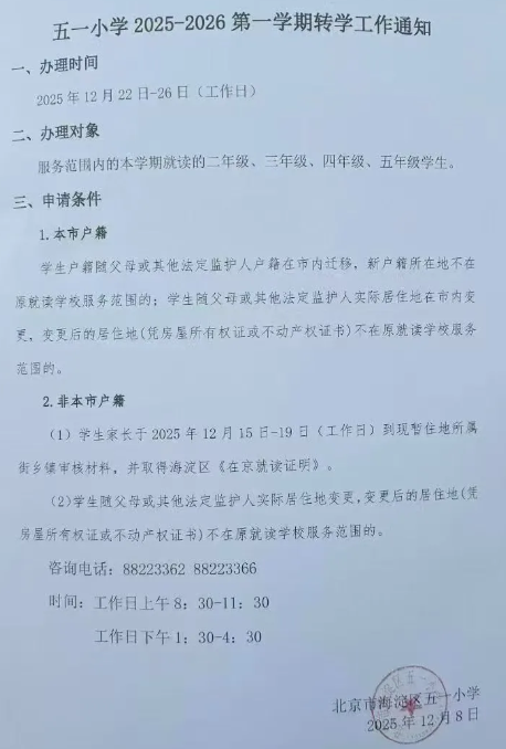 2025-2026学年第一学期海淀五一小学转学通知已发布,转学申请时间、转学申请条件、办理流程、联系方式等,具体安排说明如下: