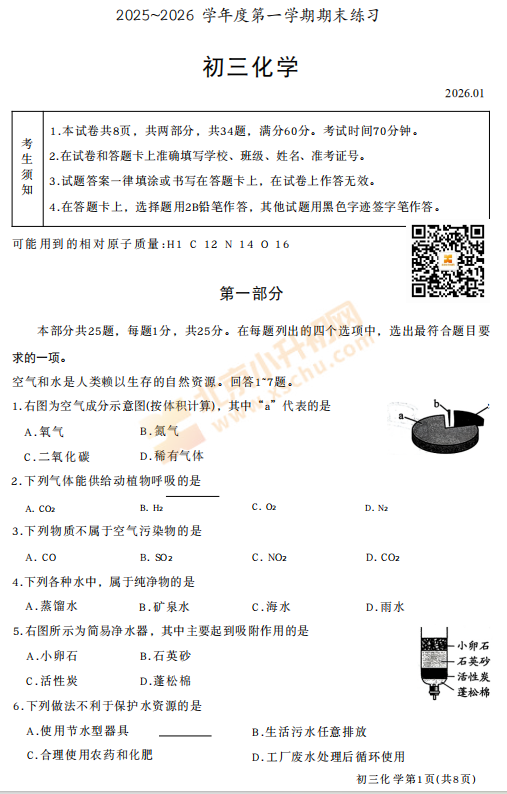 2025-2026学年(上)大兴初三期末化学试卷及答案已出炉!下载完整版试卷请点击文末pdf文件!或点击下方图片↓打包下载2026年北京各区初中期末试卷!