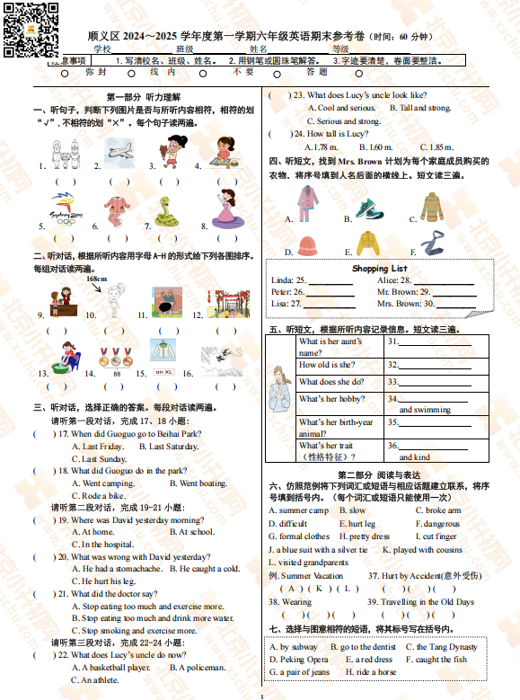 2025-2026学年(上)顺义区小学六年级英语期末试题预计在2026年1月出炉!家长可先下载去年期末试题,练习提升!新试卷公布后将更新在本页面,建议(Ctrl+D)收藏本页面!