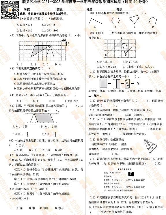 2025-2026学年(上)顺义区小学五年级数学期末试题预计在2026年1月出炉!家长可先下载去年期末试题,练习提升!新试卷公布后将更新在本页面,建议(Ctrl+D)收藏本页面!