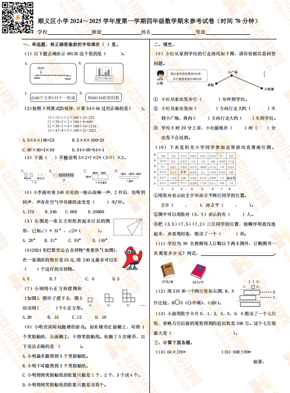 2025-2026学年(上)顺义区小学四年级数学期末试题预计在2026年1月出炉!家长可先下载去年期末试题,练习提升!新试卷公布后将更新在本页面,建议(Ctrl+D)收藏本页面!