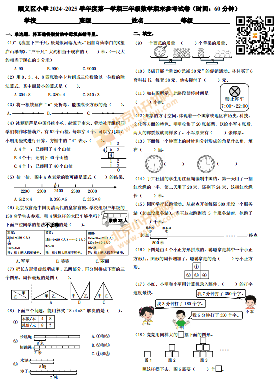 2025-2026学年(上)顺义区小学三年级数学期末试题预计在2026年1月出炉!家长可先下载去年期末试题,练习提升!新试卷公布后将更新在本页面,建议(Ctrl+D)收藏本页面!