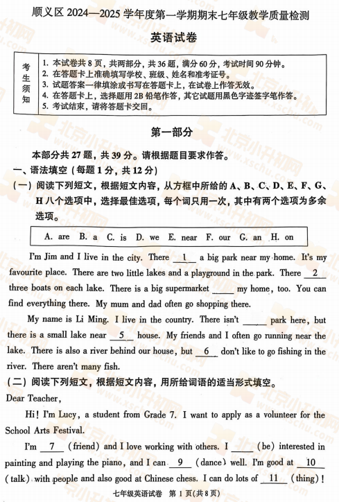 2025-2026学年(上)顺义初一期末英语试卷及答案预计在2026年1月出炉!家长可先下载去年期末试题,练习提升!新试卷公布后将更新在本页面,建议(Ctrl+D)收藏本页面!