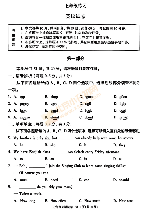 2025-2026学年第一学期顺义初一期末英语试卷及答案什么时候出?考哪些内容?如何下载?