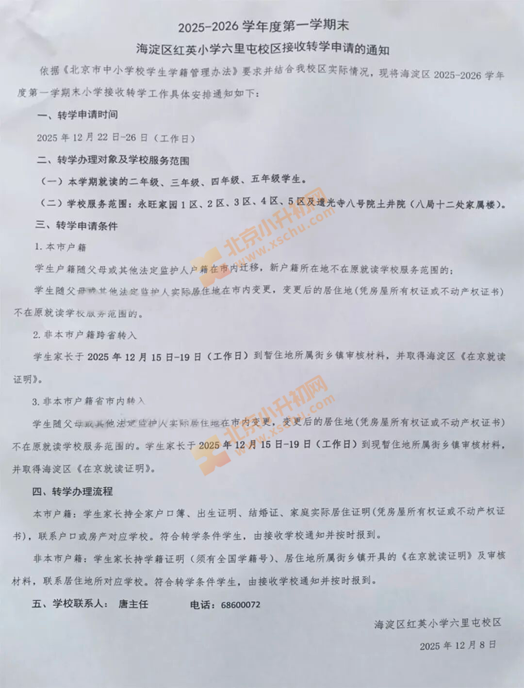 2025-2026学年第一学期红英小学六里屯校区转学通知已发布,转学申请时间、转学申请条件、办理材料、联系方式等,具体安排说明如下: