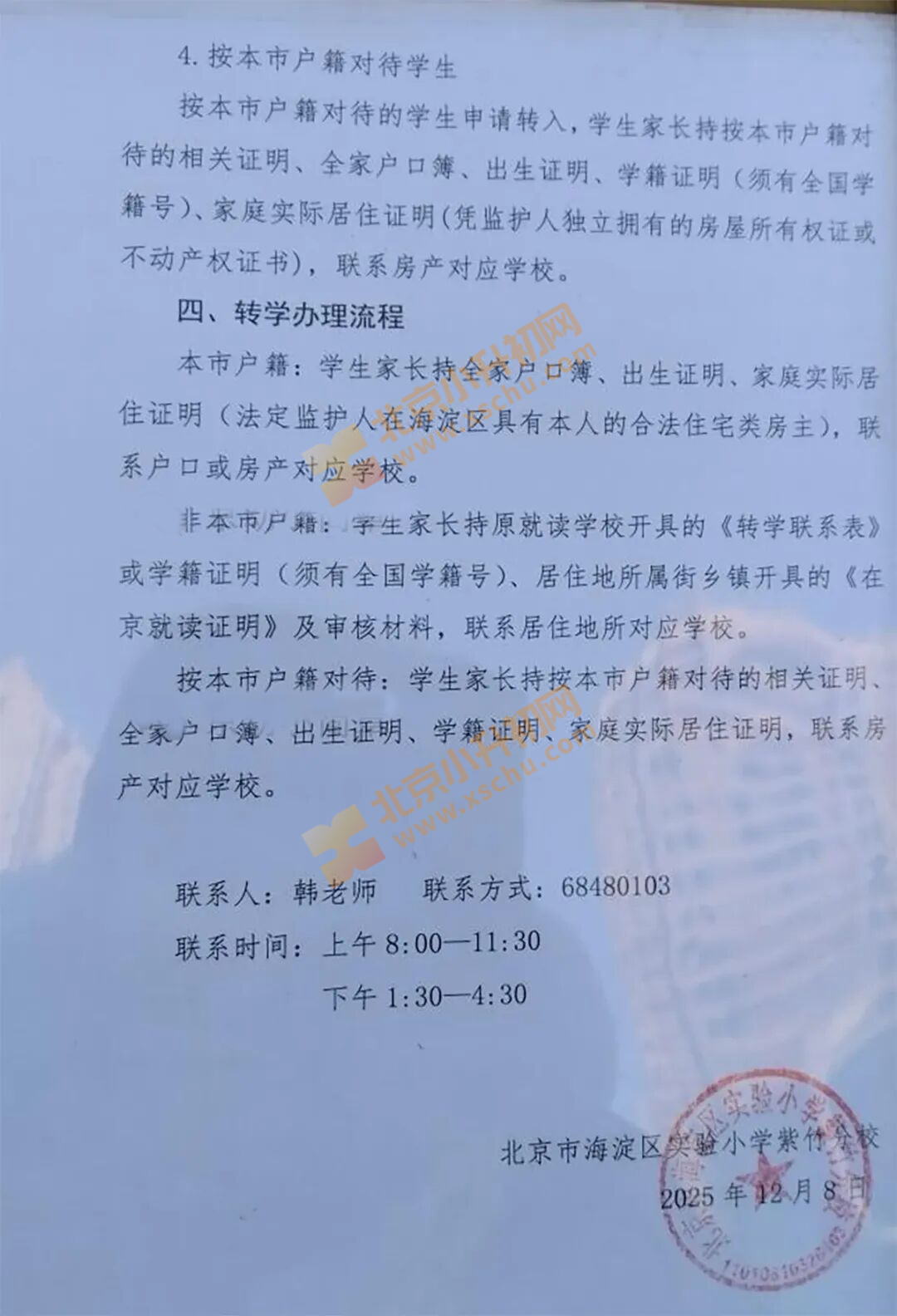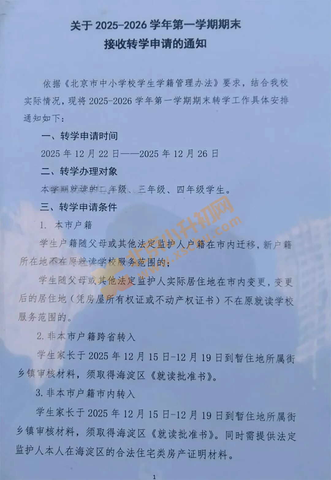 2025-2026学年第一学期海淀区实验小学紫竹分校转学通知已发布,转学申请时间、转学申请条件、办理材料、联系方式等,具体安排说明如下: