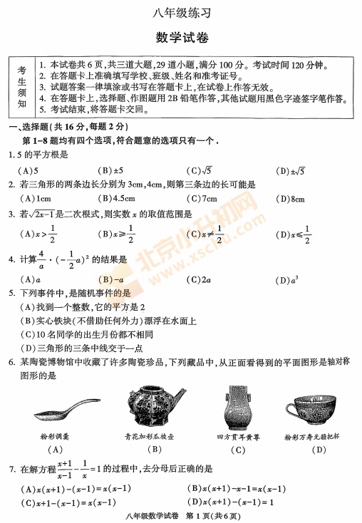 2025-2026学年第一学期顺义初二期末数学试卷及答案什么时候出?考哪些内容?如何下载?