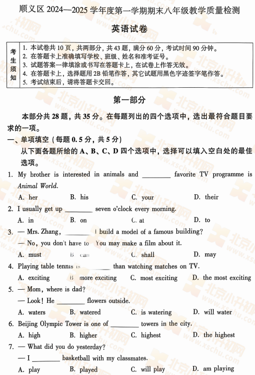 2025-2026学年(上)顺义初二期末英语试卷及答案预计在2026年1月出炉!家长可先下载去年期末试题,练习提升!新试卷公布后将更新在本页面,建议(Ctrl+D)收藏本页面!