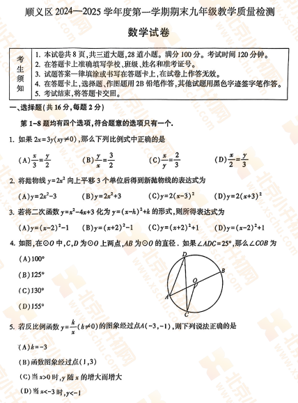 2025-2026学年(上)顺义初三期末数学试卷及答案预计在2026年1月出炉!家长可先下载去年期末试题,练习提升!新试卷公布后将更新在本页面,建议(Ctrl+D)收藏本页面!