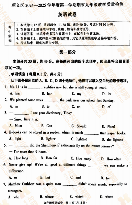 2025-2026学年(上)顺义初三期末英语试卷及答案预计在2026年1月出炉!家长可先下载去年期末试题,练习提升!新试卷公布后将更新在本页面,建议(Ctrl+D)收藏本页面!