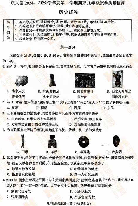 2025-2026学年(上)顺义初三期末历史试卷及答案预计在2026年1月出炉!家长可先下载去年期末试题,练习提升!新试卷公布后将更新在本页面,建议(Ctrl+D)收藏本页面!