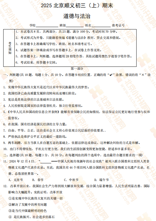 2025-2026学年(上)顺义初三期末道德与法治试卷及答案预计在2026年1月出炉!家长可先下载去年期末试题,练习提升!新试卷公布后将更新在本页面,建议(Ctrl+D)收藏本页面!