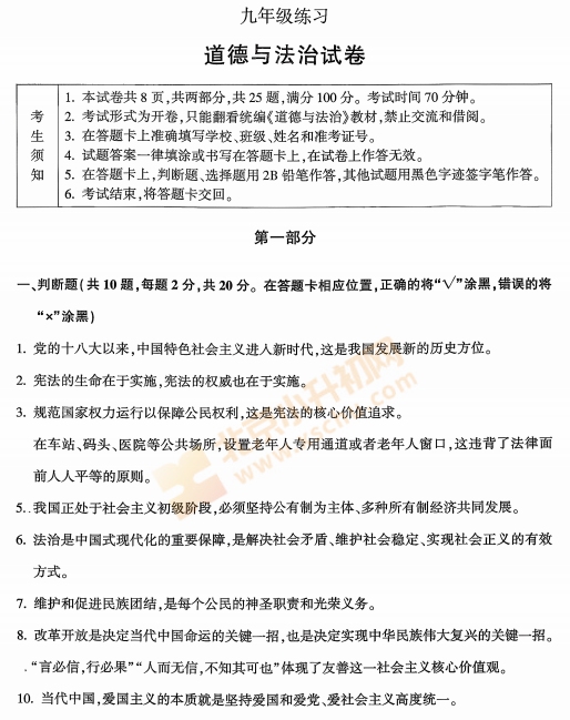 2025-2026学年第一学期顺义初三期末道德与法治试卷及答案什么时候出?考哪些内容?如何下载?