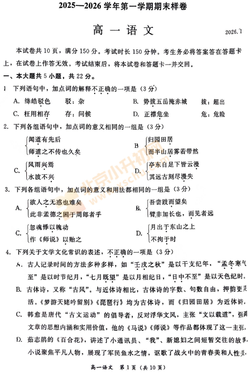 2025-2026学年(上)东城高一期末语文试卷已出炉!下载完整版试卷请点击文末pdf文件!或点击下方图片↓打包下载2026年北京各区高中期末试卷!
