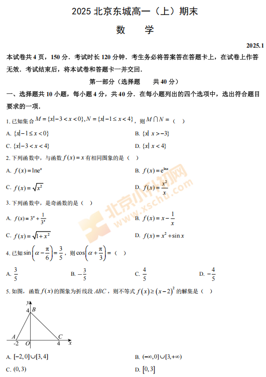 2025-2026学年第一学期东城高一期末数学试卷及答案什么时候出?考哪些内容?如何下载?