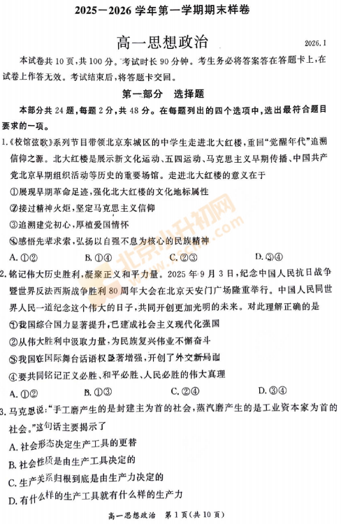 2025-2026学年(上)东城高一期末政治试卷已出炉!下载完整版试卷请点击文末pdf文件!或点击下方图片↓打包下载2026年北京各区高中期末试卷!