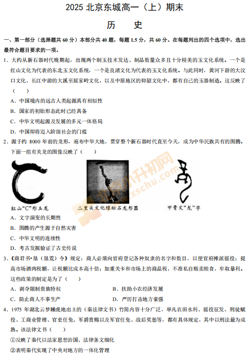 2025-2026学年(上)东城高一期末历史试卷及答案预计在2026年1月出炉!家长可先下载去年期末试题,练习提升!新试卷公布后将更新在本页面,建议(Ctrl+D)收藏本页面!